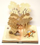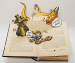 Master paper engineer Robert Sabuda has created another book sculpture for pop-up enthusiasts of all ages. In this volume of fractured fairytales, a brave (if slightly goofy) knight pursues a maligned and misunderstood dragon.  The duo escape from their story and onto the pages of other fairytales, ranging from Aladdin to Cinderella. The escapees wreak havoc on each tale they visit, while each page reveals a more complex and imaginative three-dimensional creation than the last.  While there is text on each page, it’s not really here to be read. Rather,  it demonstrates the ruckus caused by the intruders – fairytales are obscured by towering structures of fire-breathing dragons, and even some of the characters pop-up sheathed in outfits made of words. (See Cinderella’s dress and Aladdin’s flying carpet.) Sabuda paper art books makes stunning gifts, but they are delicate – with so many intricate folds and pleats, very young readers should be supervised, lest older readers wish to spend hours carefully refolding dragon tails and towers. This tour de force will make an excellent addition to any collection on paper engineering.