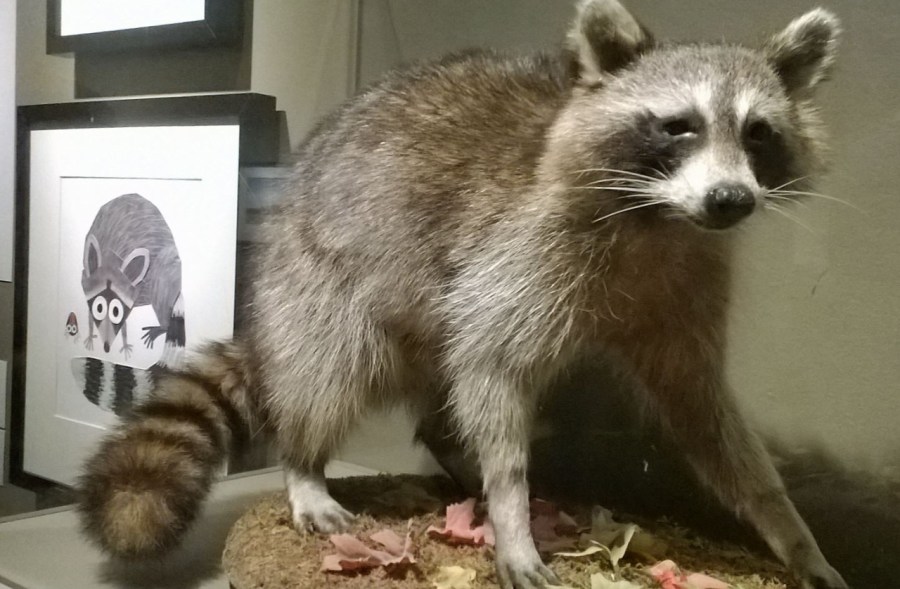 Taxidermied raccoon and image from The Raccoon and the Ladybug, 2015, by Brendan Wenzel. Watercolor, acrylic, colored pencil, & crayon. (photo credit: BB Richter)