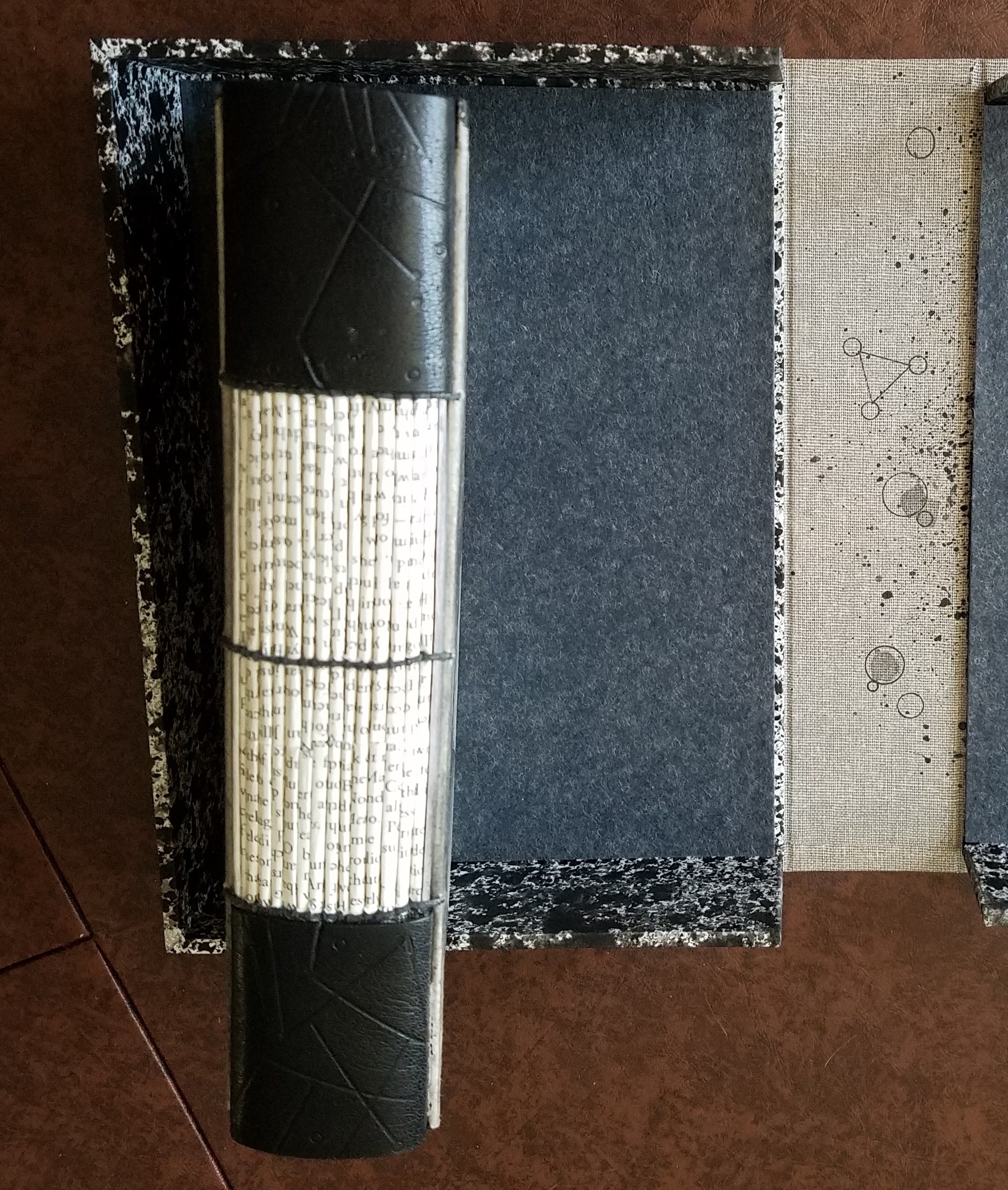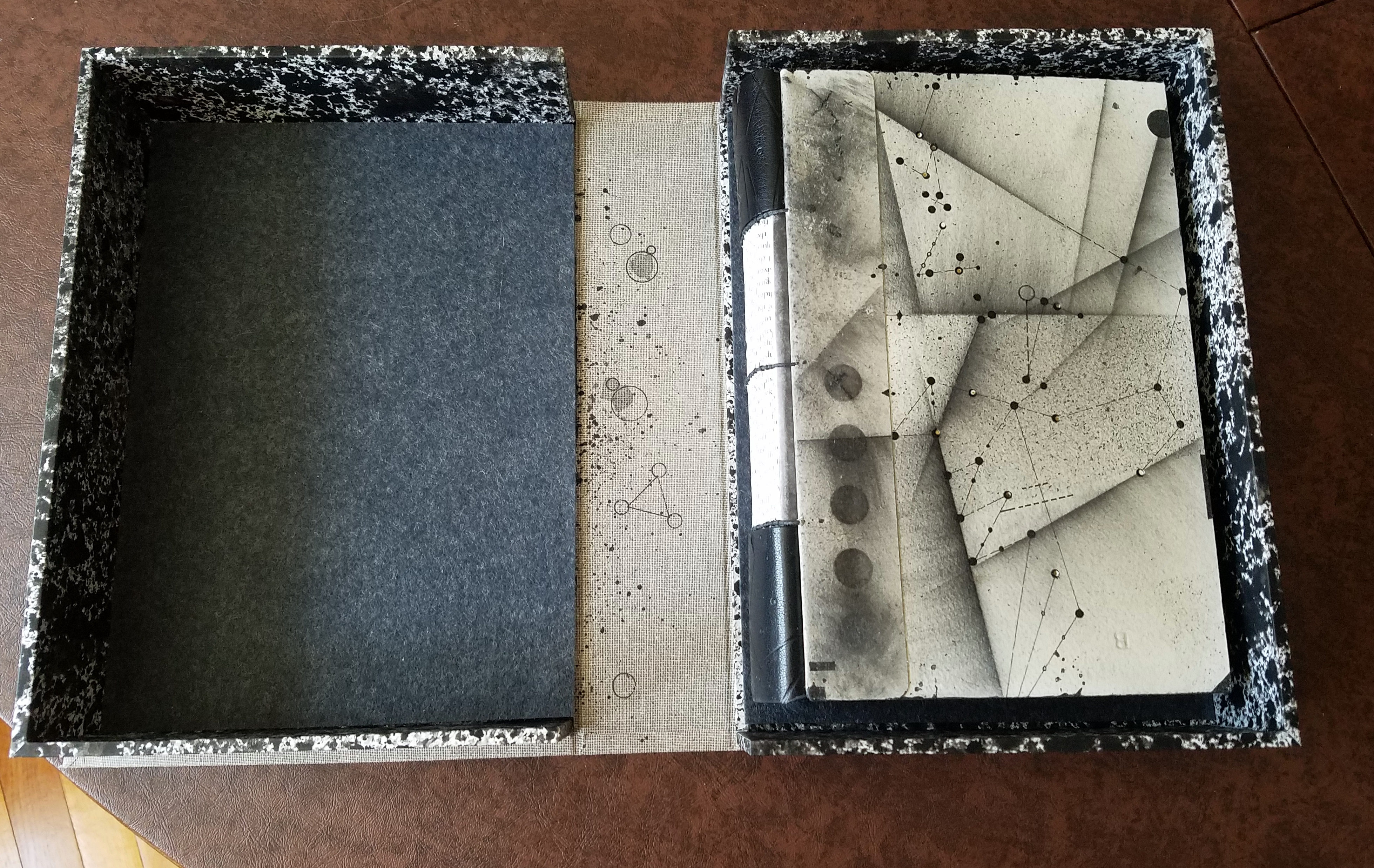 Unwrapped, Basbanes came face-to-face with his book, now clad in a creamy off-white clamshell box with marbled borders. The book itself is now bound with strips of handmade Japanese paper, papyrus strips, and leather. Peppering the front and back boards are Ely’s own glyphs–symbols the artist calls “cribform” that take on different meanings depending on their placement and the tool used to create them. It is, said Basbanes, “a most exquisite piece of art.”