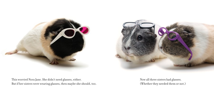 Philomena the guinea pig has fuzzy vision, so she gets new glasses. But her sister Audrey thinks Philomena looks cool, so she gets glasses, too. Soon, their littlest sister, Nora Jane, gets worried–if her sisters are wearing glasses, shouldn’t she? Then, all three sisters want new purses and dresses, and instead of being happy with their things, they’re all very miserable. The author’s photographs of real guinea pigs wearing dresses are very funny, and show that it’s important for everyone–even guinea pigs–to just be themselves. Don’t skip the end pages for “deleted scenes!”
